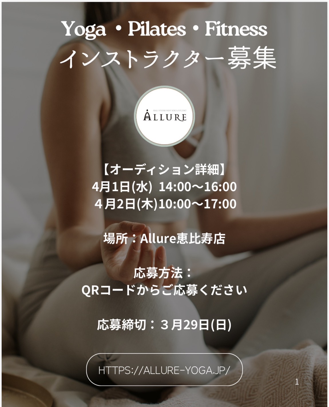 ALLUREでは、ヨガ・ピラティス・フィットネスのインストラクターを募集しております。